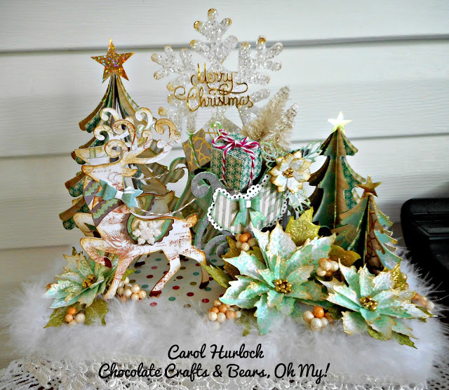 The sleigh is filled with presents and bottle brush Christmas trees. Those presents are 1" cubes I created myself with my Martha Stewart score board-tied with bakers twine, of course! The 3D trees are Sizzix Brenda Walton Christmas Tree Die. Besides Tim Holtz, Brenda Walton is another favorite of mine. Her dies are so sweet and very easy to put together!Look here!!! Another color variation. Of course, I just had to do a pink one. Here you can see the lovely trees and Poinsettia again. For these Poinsettia I used Spun Sugar and Victorian Velvet. The paper collection is digital from Nitwit Collections called Holiday Bouquet. I just love that paper collection so much. You will be seeing more holiday projects from me using that paper.
